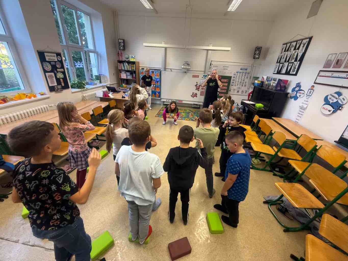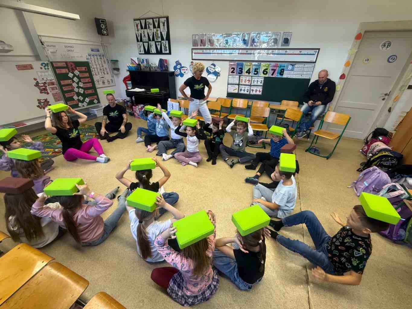 V další části programu si žáci zkoušeli uvolňovací techniky s pěnovými kostkami, které si měli položit na hlavu a zkusit si dřepnout nebo chodit, aniž by jim kostka spadla. Poté po kostkách přecházeli, což vyžadovalo soustředění, trpělivost a rovnováhu.
